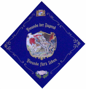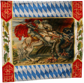 und einem Rautenmuster ist der heilige Georg dargestellt, wie er den Drachen besiegt. Die Darstellung ist offensichtlich kein Einzelfall, sie findet sich beispielsweise auch auf der Fahne des Katholischen Burschenvereins Schöffelding. Der heilige Georg ist zwar historisch nicht nachweisbar und nur legendenhaft überliefert, aber diese Gestalt eignete sich als Vorbild für eine ländliche Jugendorganisation in mehrfacher Weise:
