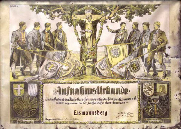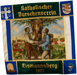 Dass der Eismannsberger Burschenverein dennoch aus der Tradition des katholischen Vereinswesens hervorging, belegt schon, dass er als „Katholischer Burschenverein” gegründet wurde. Entsprechend dicht fanden die kirchlichen Motive auch auf der 1923 geweihten Fahne Eingang. Sie ist damit die wohl aussagekräftigste Quelle aus der Gründungszeit. Die Fahnenweihen erfolgten meist kurz nach der Vereinsgründung und stellten den ersten großen organisatorischen und finanziellen Kraftakt dar.